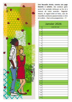 Je vous ai concocté un calendrier sous le signe de l’Amour, avec, pour chaque mois, une peinture d’amoureux, un texte de motivation pour le mois, et quand même, évidemment, les jours du mois, où vous pourrez écrire les anniversaires et invitations.